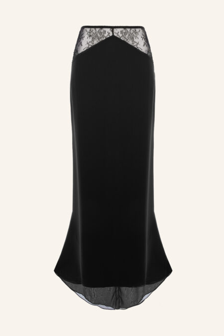 Featuring a plunging V-neckline and strategically place sheer lace diamond panels, the dress is bias cut and drapes beautifully. Mixing Silk Satin with Silk Georgette and Chantilly Lace as bold geometrics inserts adding a daring and modern edge to the classic bias-cut slip dress silhouette.